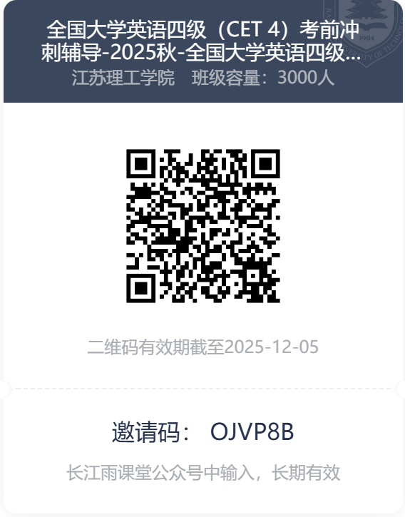 5.全国大学英语四级(CET 4)考前辅导长江雨课堂邀请码: